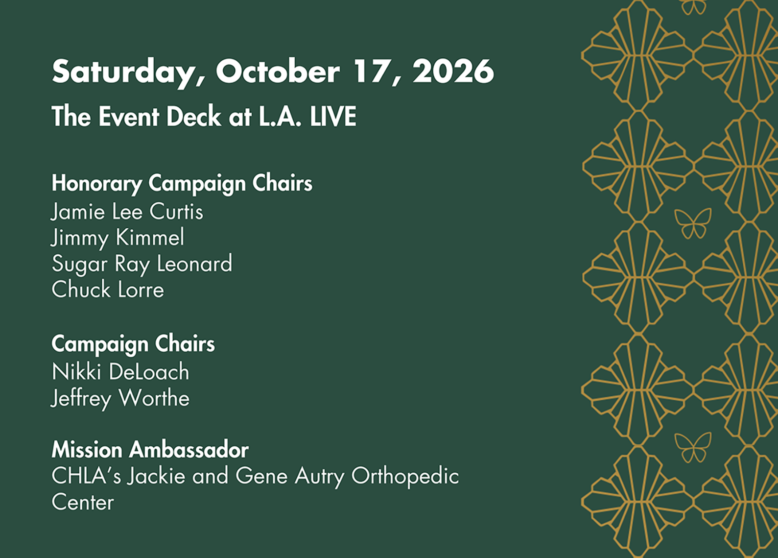 The gala will take place at The Event Deck at L.A. LIVE in downtown Los Angeles on October 17, 2026. It will be an evening to remember as we honor the inspiring philanthropy of our greatest advocates and partners with exciting entertainment, exceptional cuisine, and an inspirational program highlighting the hospital’s latest achievements made possible by our generous community.